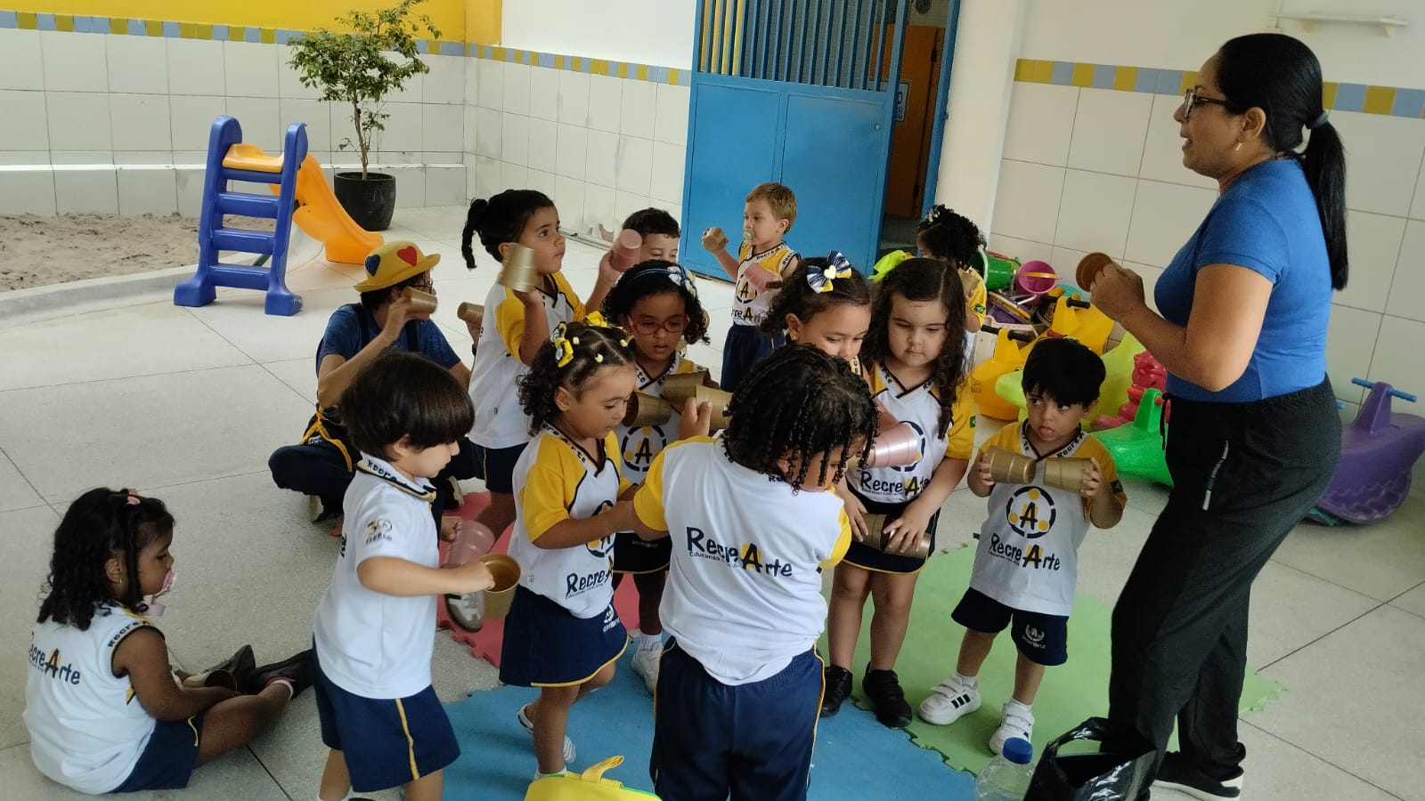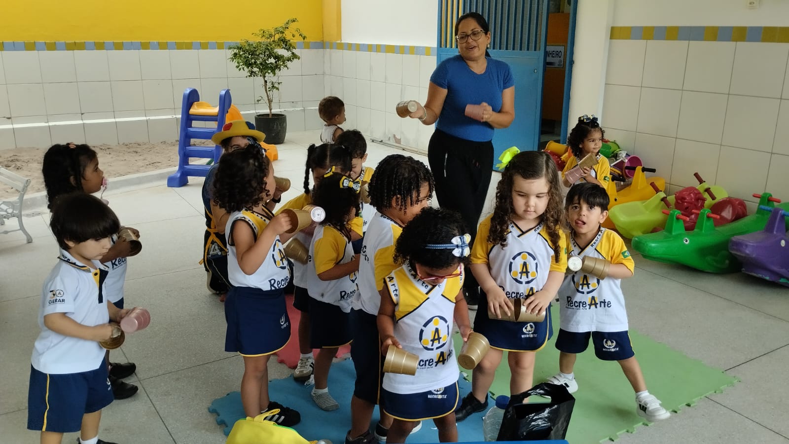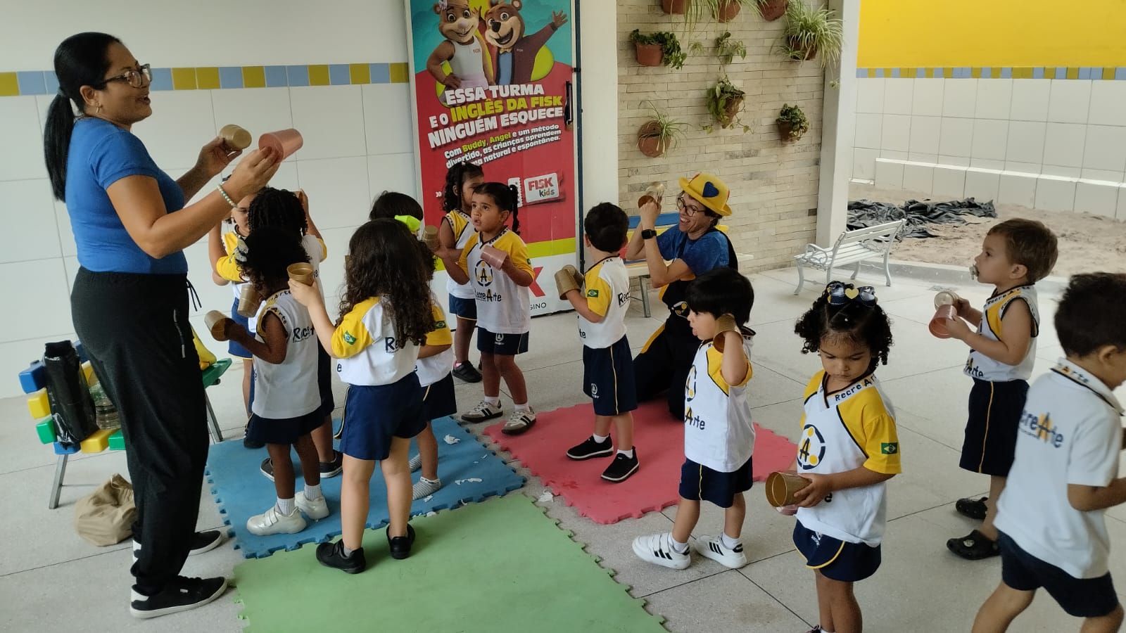 Na aula de música com a Tia Alba, a turma do G2 descobriu que até um simples copo de plástico pode virar instrumento, som e alegria.