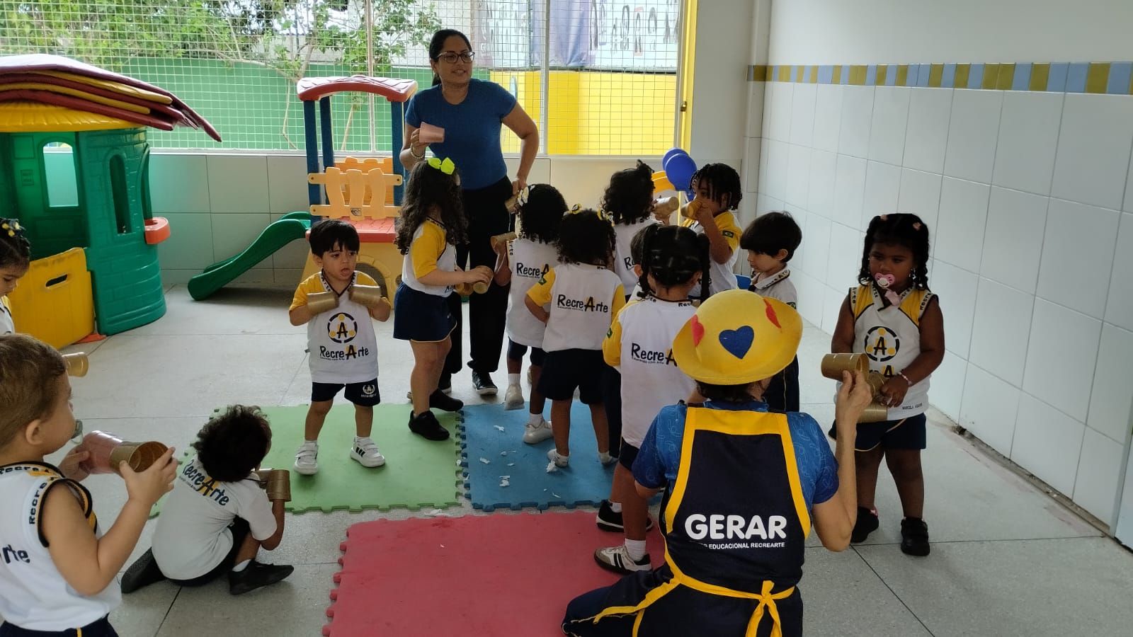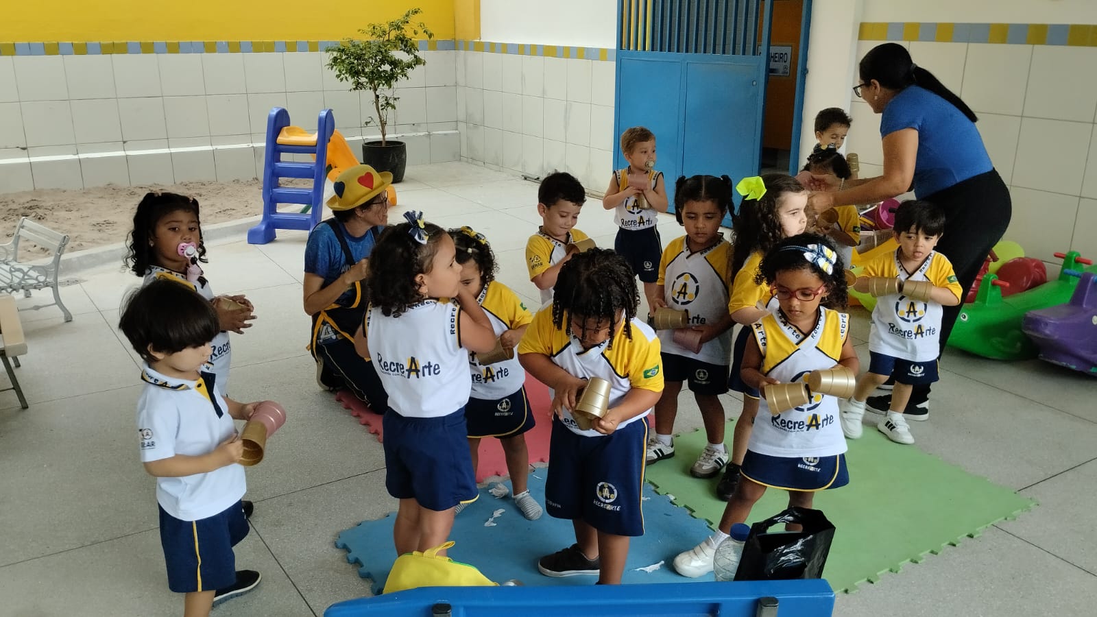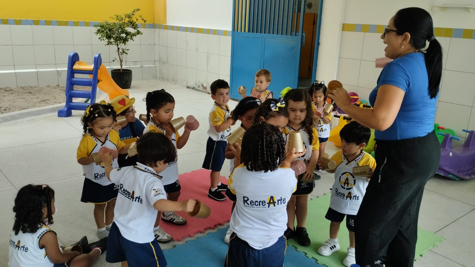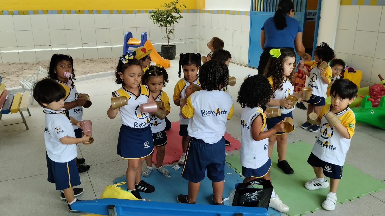Na aula de música com a Tia Alba, a turma do G2 descobriu que até um simples copo de plástico pode virar instrumento, som e alegria.
