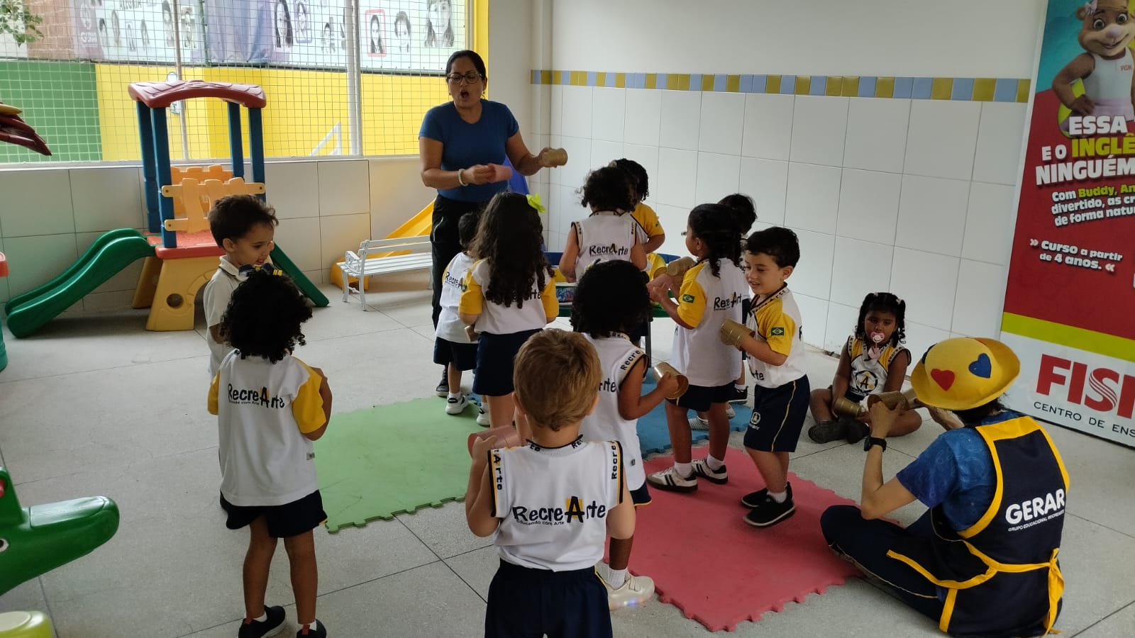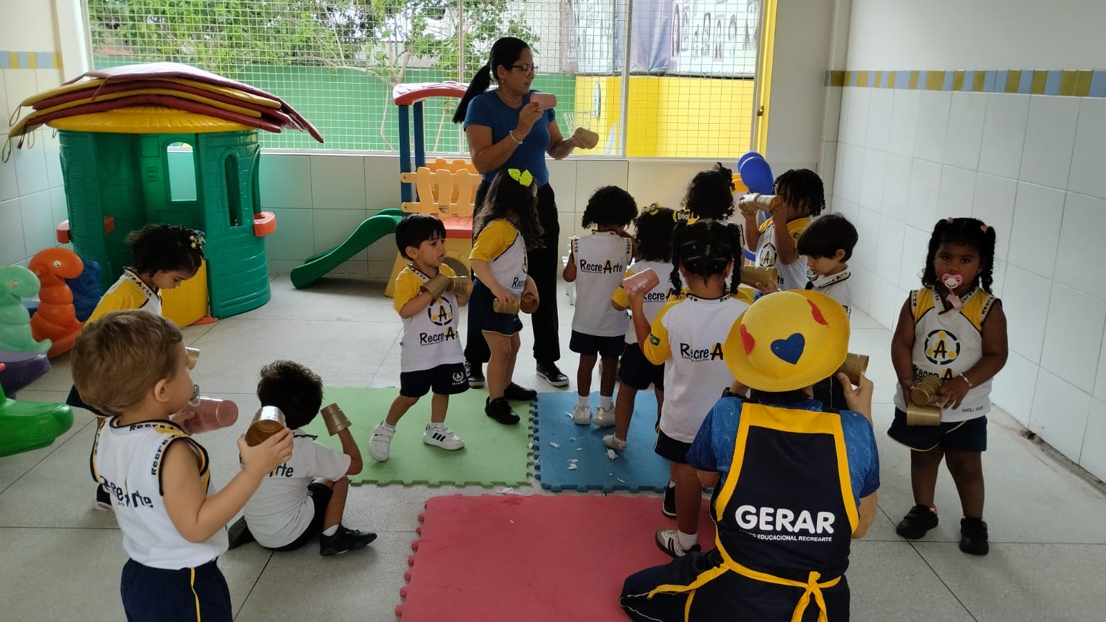 Entre batidas, risadas e muita concentração, as crianças trabalham coordenação motora, atenção, percepção auditiva e, principalmente, a expressão das emoções.